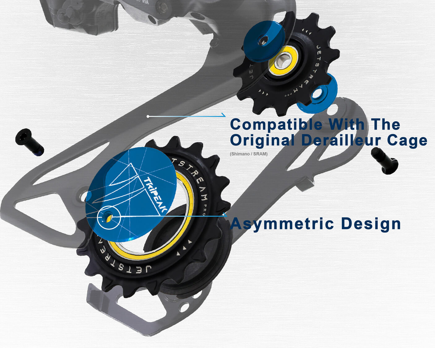 Developed by TRiPEAK, our patented asymmetric pulley frame design allows for an increase in tension pulley size to 18 teeth while seamlessly fitting into the original derailleur cage with minimal modifications, maximizing operational efficiency.